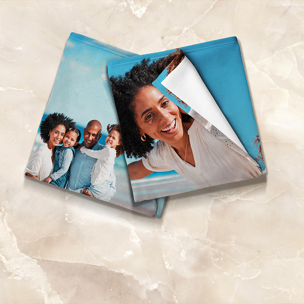 La stampa fronte-retro è disponibile per le nostre coperte in pile e pile accoglienti, così puoi personalizzare sia il davanti che il retro con foto, layout, testo o sfondi.