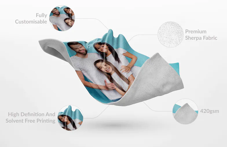 Offriamo una varietà di opzioni di tessuto per adattare la tua coperta fotografica personalizzata alle tue preferenze di comfort personale. Scegli le nostre coperte personalizzate sherpa o intrecciate per una sensazione più spessa e pesante.